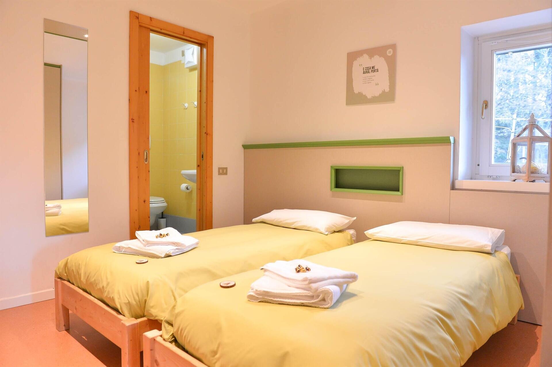 Die Unterkunft verfügt über 72 Betten, unterteilt in Doppel-, Dreibett- und Vierbettzimmer, einfach aber komfortabel, alle mit eigenem Bad und Dusche ausgestattet. Die Räume sind hell, sicher und so gestaltet, dass sie einen ruhigen und angenehmen Aufenthalt gewährleisten.