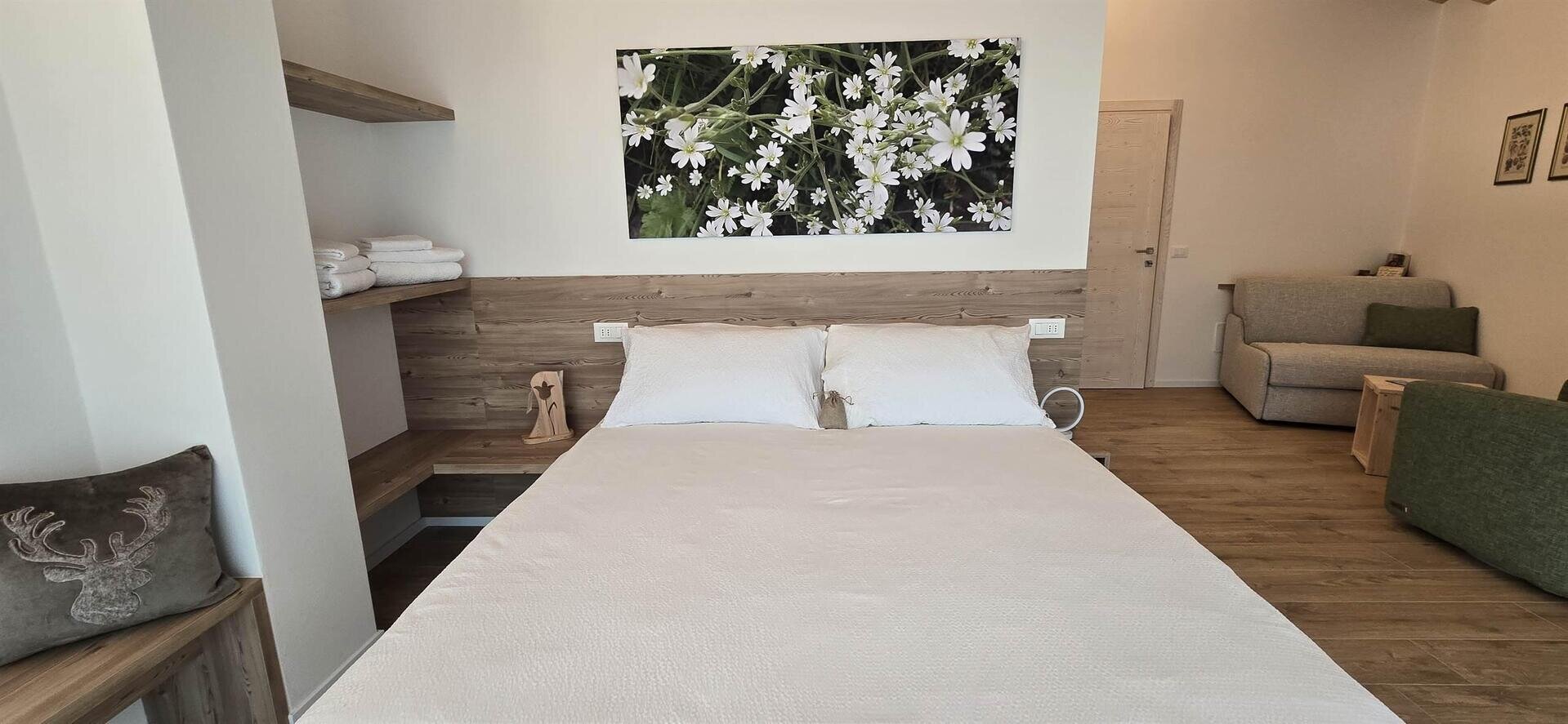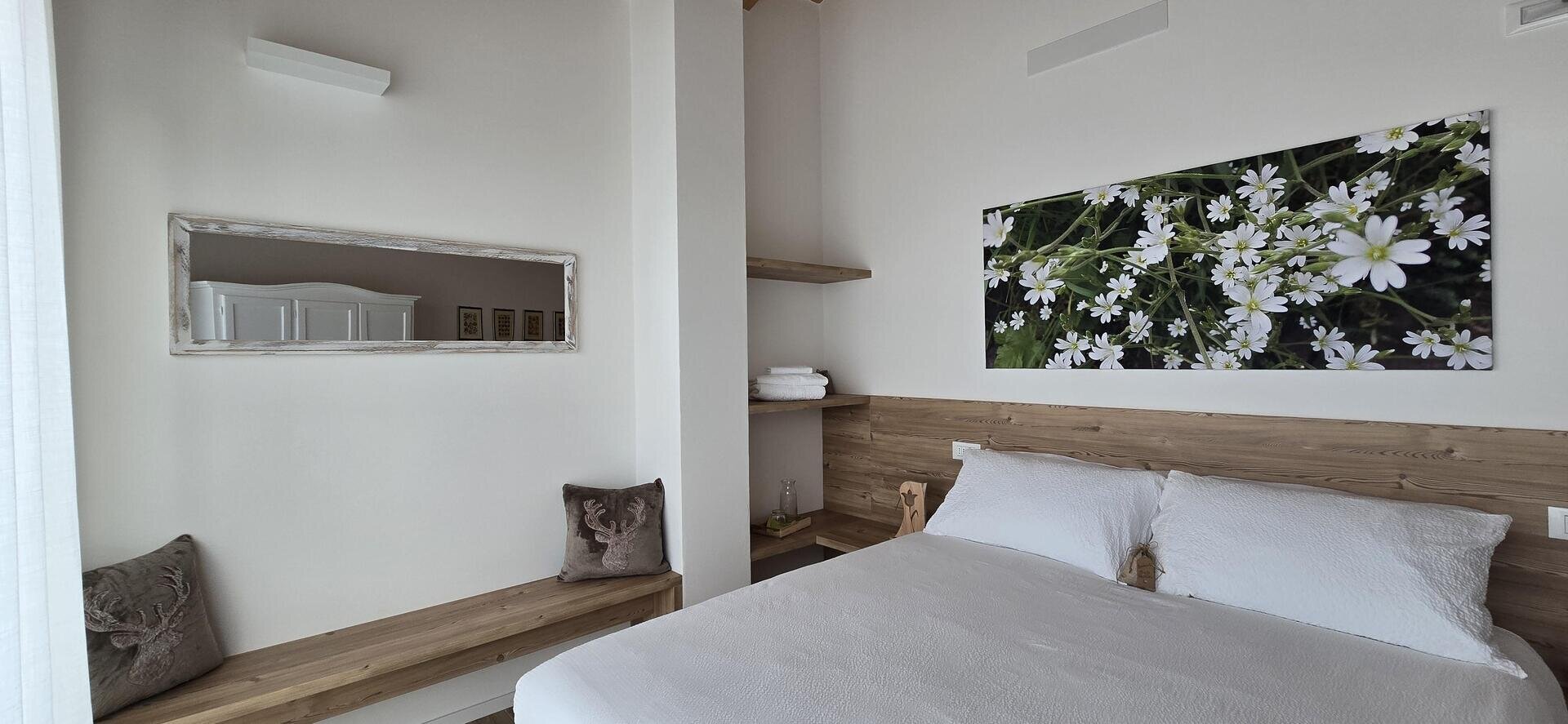 Jedes Zimmer, das durch eine warme und alpine Atmosphäre gekennzeichnet ist, verfügt über einen eigenen Balkon, ein Badezimmer und Pflegeprodukte, die in Trentino aus biologisch abbaubaren Rohstoffen hergestellt werden.
