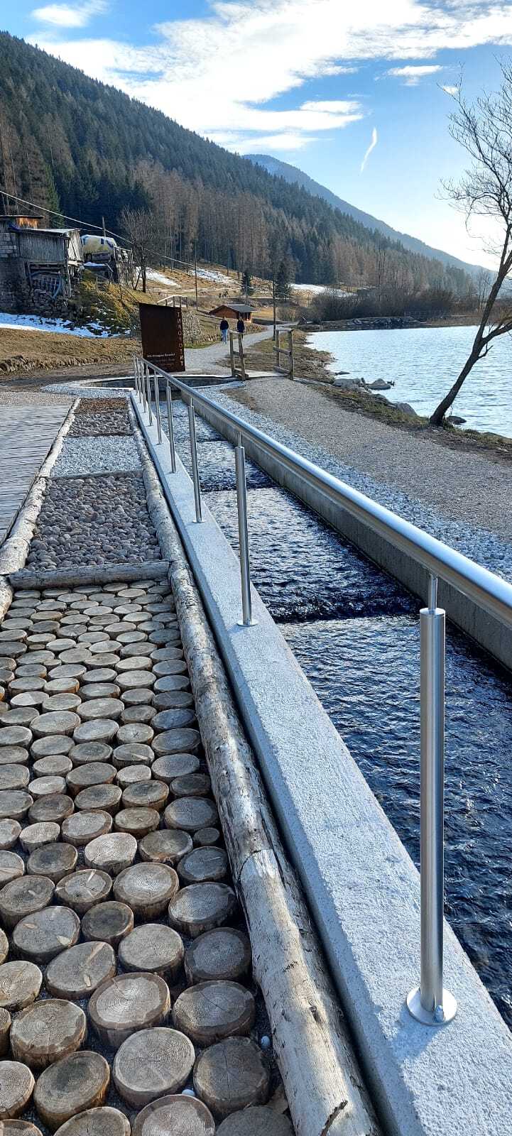 Die Route sieht vor, barfuß eine Verbindung zwischen zwei Becken zu gehen, die 30 cm fließendes kaltes Wasser direkt aus dem Fluss Brusago enthalten, und schließt sich in einem Ring, indem natürliche Materialien aus Holz und Stein betreten werden, die in der Lage sind, die von der Sonne kommende Energie zu speichern und bei verschiedenen Temperaturen wieder abzugeben.