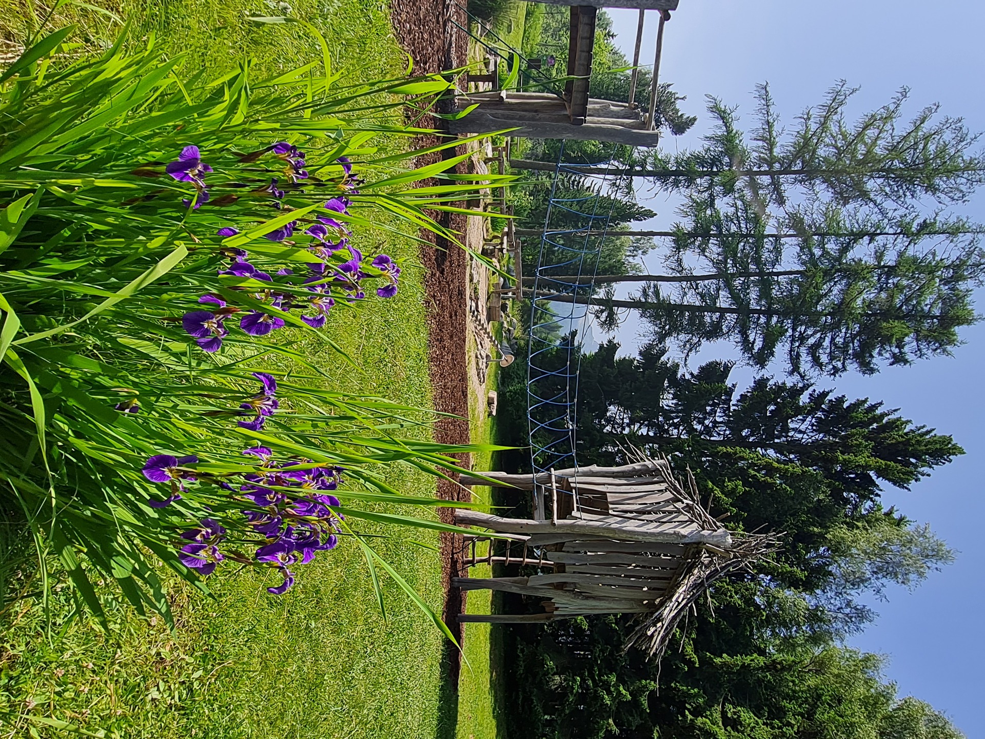 Ein Spielplatz aus natürlichen Materialien wie Holz, Seil und Metall.