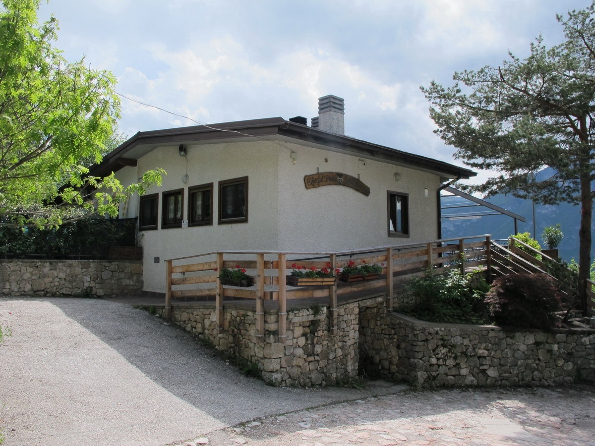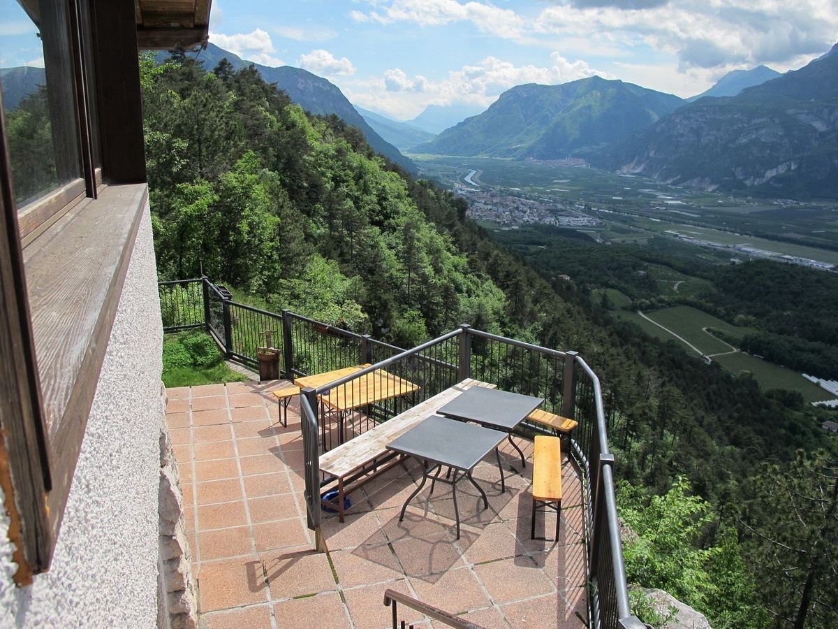 Die Bindesi-Hütte, die auf einem Felsvorsprung über dem Dorf Villazzano liegt, bietet einen sehr weiten Blick über das gesamte Etschtal.