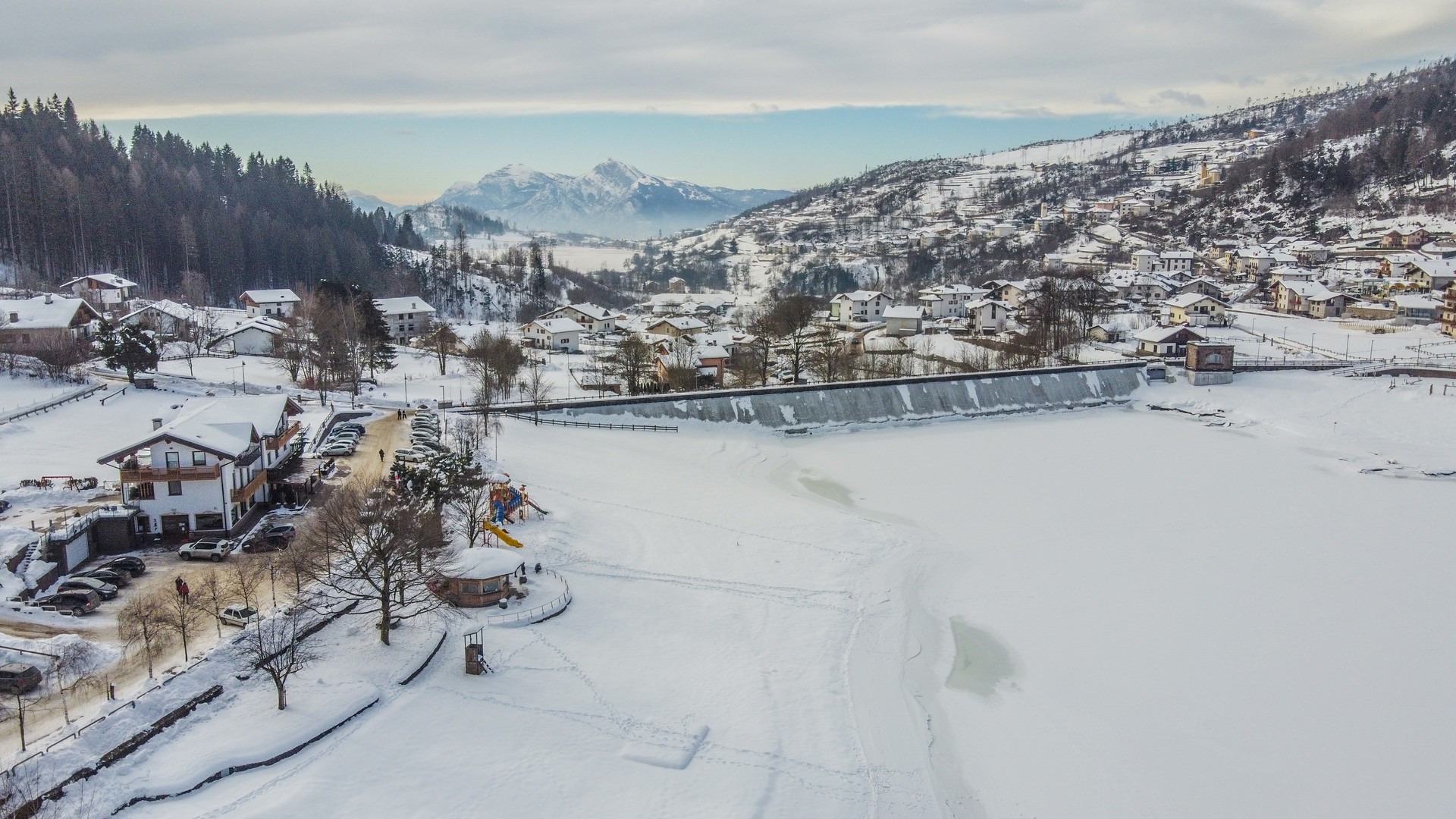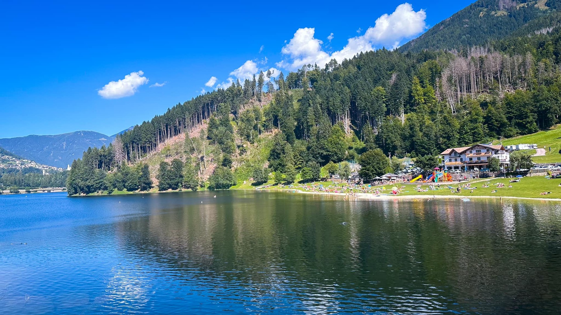 Neben dem Damm, der das Südufer des Lago delle Piazze direkt unterhalb der Bar Alla Spiaggia schließt, befindet sich ein malerischer Strand, der sorgfältig mit einem farbenfrohen Spielplatz für Kinder, einem Basketballplatz für Kinder und schließlich einer weichen Rasenfläche ausgestattet ist.