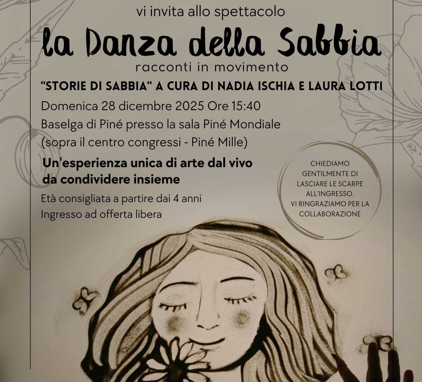 Percorsi Espressivi Super Piné presenta "La danza della sabbia", un'occasione unica di venire in contatto con l'arte che prende forma attraverso il movimento: un movimento che fa parte di tutti noi, che ci esprime e ci caratterizza. Non mancare a questo magico appuntamento sotto le feste di Natale.