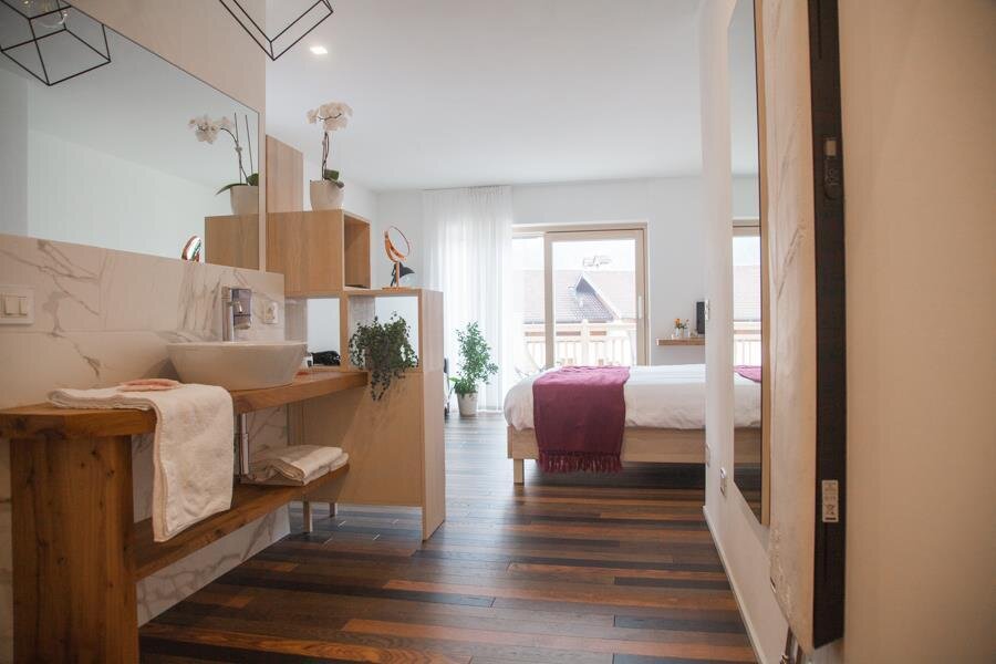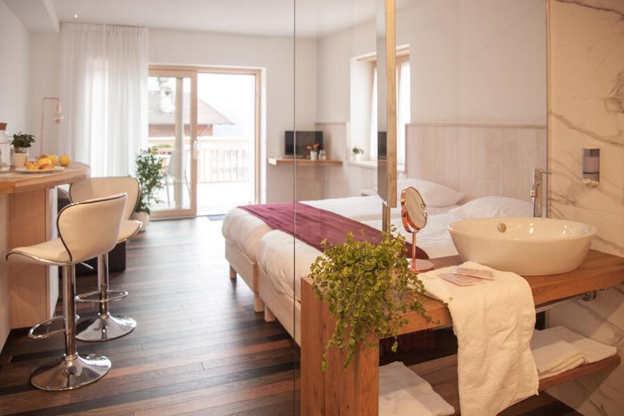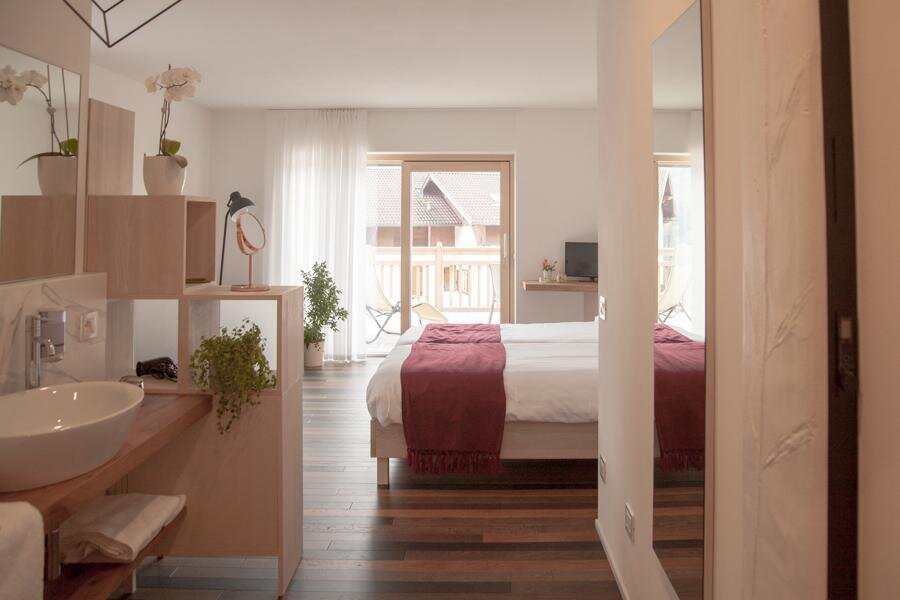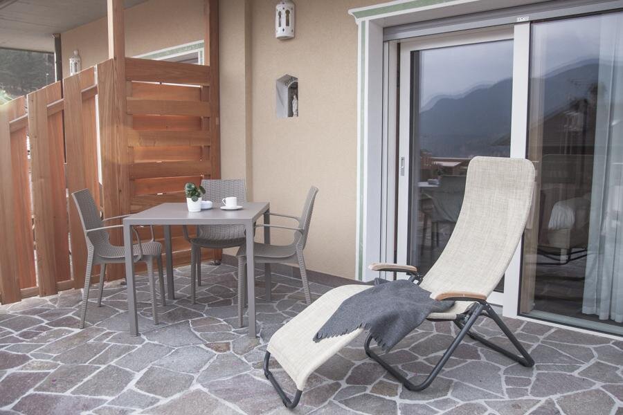 Our house offers two brand new, spacious, and bright rooms furnished in a modern design, while still incorporating wood to respect tradition. Both have a large terrace equipped with chairs, a table, and an umbrella with a view of the lake and mountains.