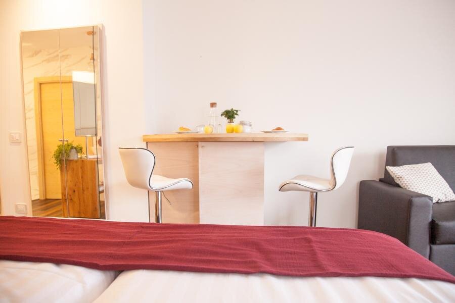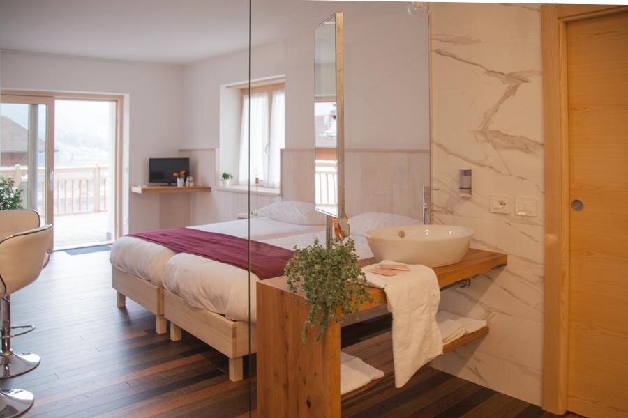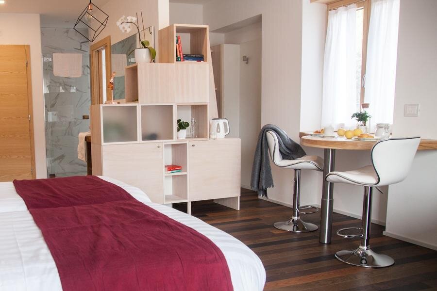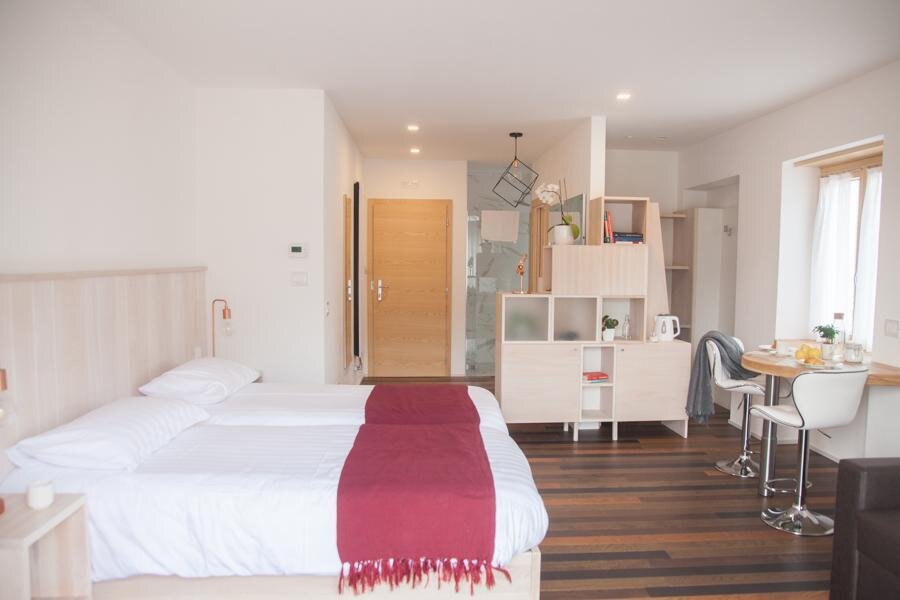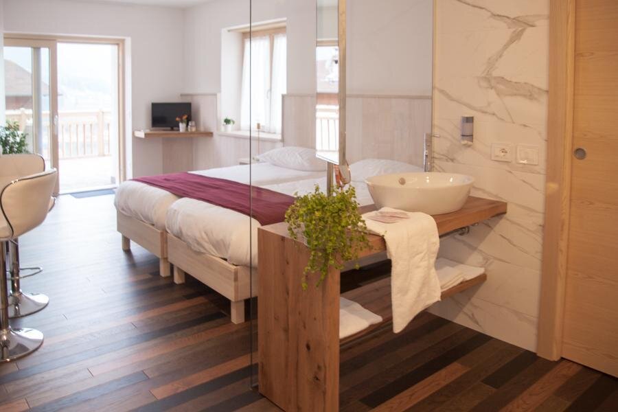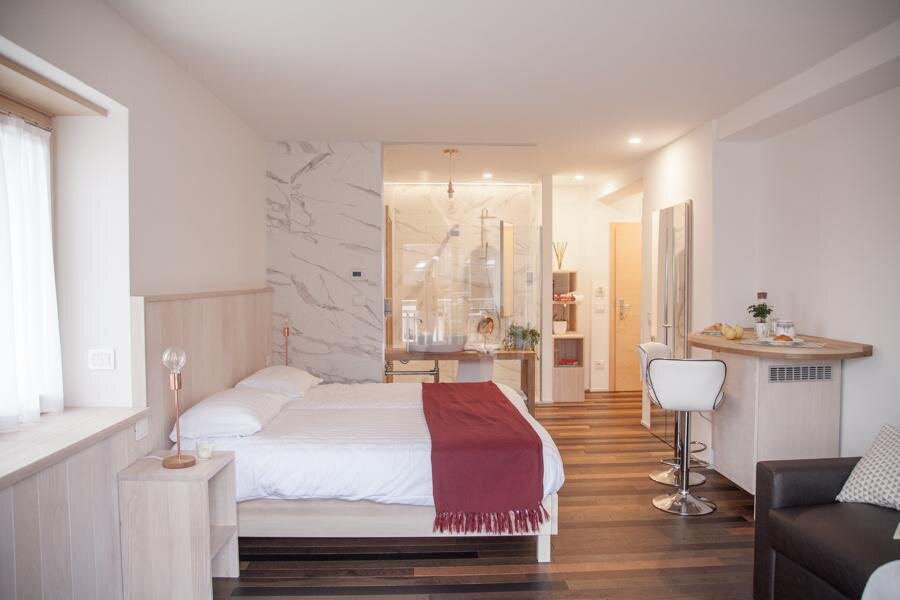 Upon waking, you can enjoy a rich sweet and savory breakfast, which can also be served in the room upon request. We also have the option of a ground-floor apartment with two bedrooms, a bathroom, a fully equipped kitchen, and a large outdoor veranda; this apartment is also available for weekly rental.