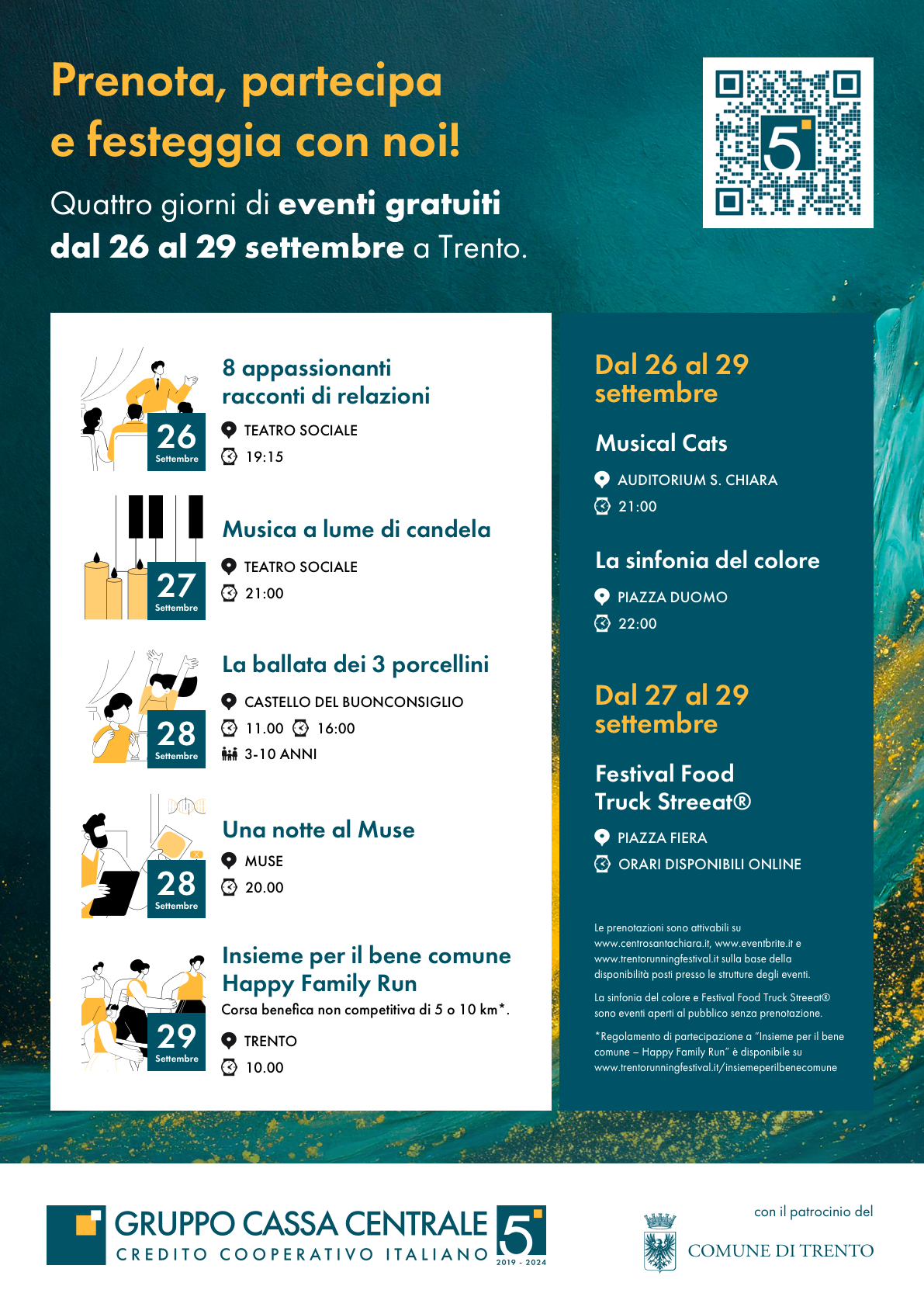 The 50th anniversary of the "Cassa Centrale Banca" will be celebrated from Thursday 26 to Sunday 29 September 2024 in the city of Trento.