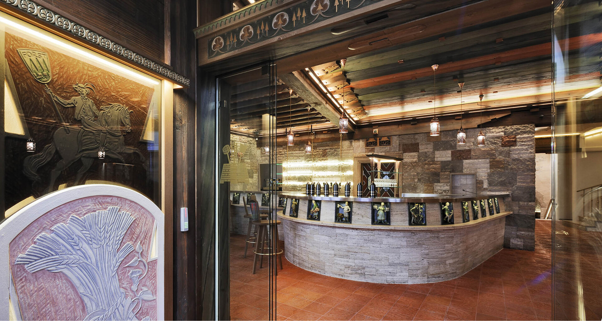 L’ingresso conduce a interni caratterizzati da sapiente lavorazione del legno, arredi tradizionali, pareti in pietra e dettagli tipici come stufe in maiolica e un imponente bancone bar, che raccontano la storia e la cultura della ristorazione locale.