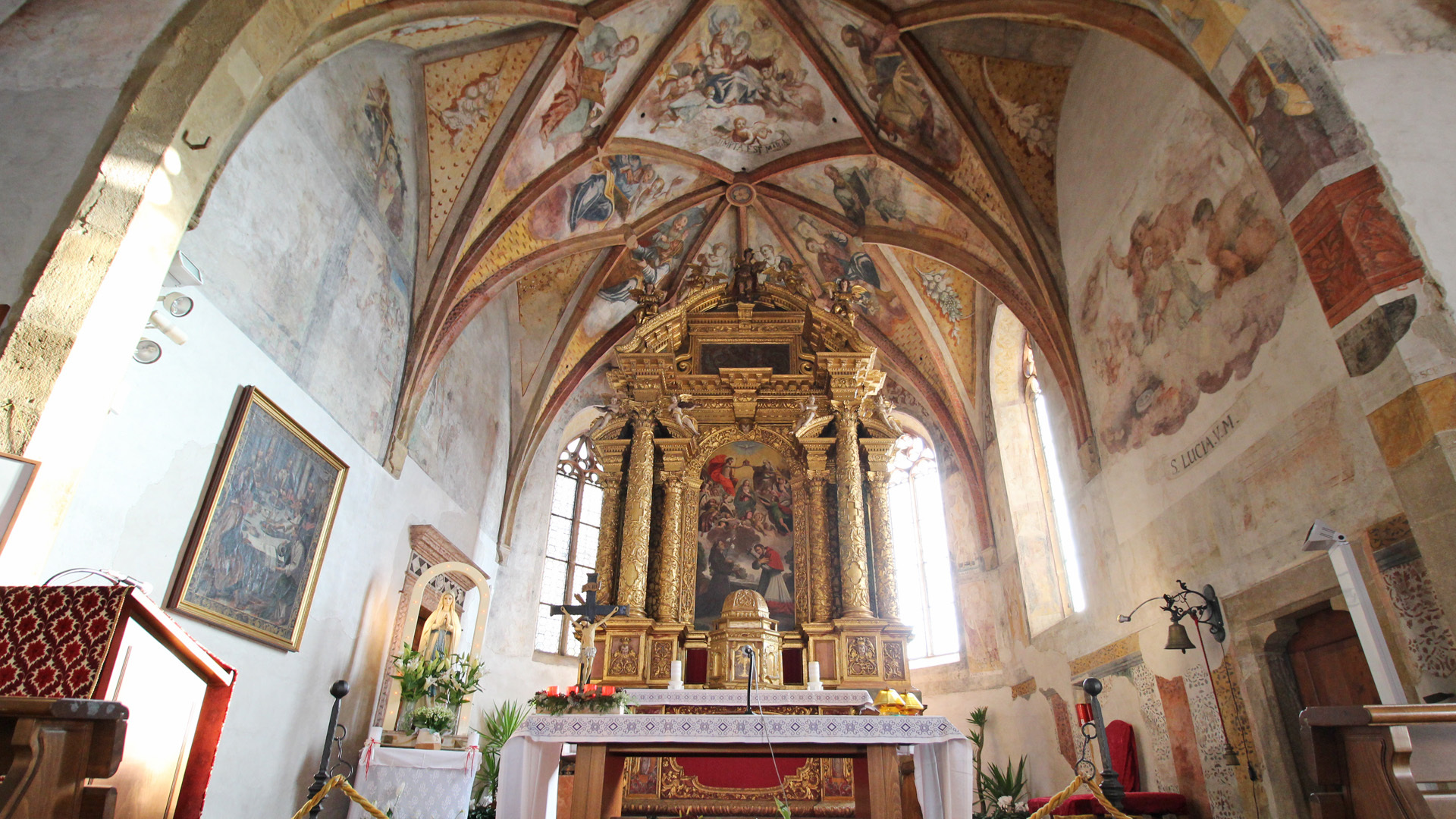 The main altar, in Baroque style, is in carved and gilded wood; the altarpiece is the work of Pozzi, an artist who worked on the Piné Plateau in the mid-seventeenth century.
