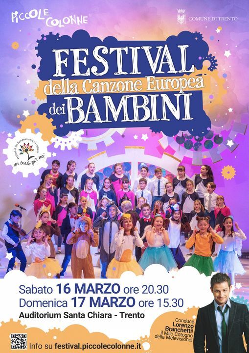 Il Festival della Canzone europea dei Bambini, momento conclusivo del concorso Un Testo per noi, promosso dal Coro Piccole Colonne APS e rivolto alle classi delle scuole primarie, torna con la 17^ edizione che si svolgerà sabato 16 e domenica 17 marzo all’Auditorium Santa Chiara di Trento.