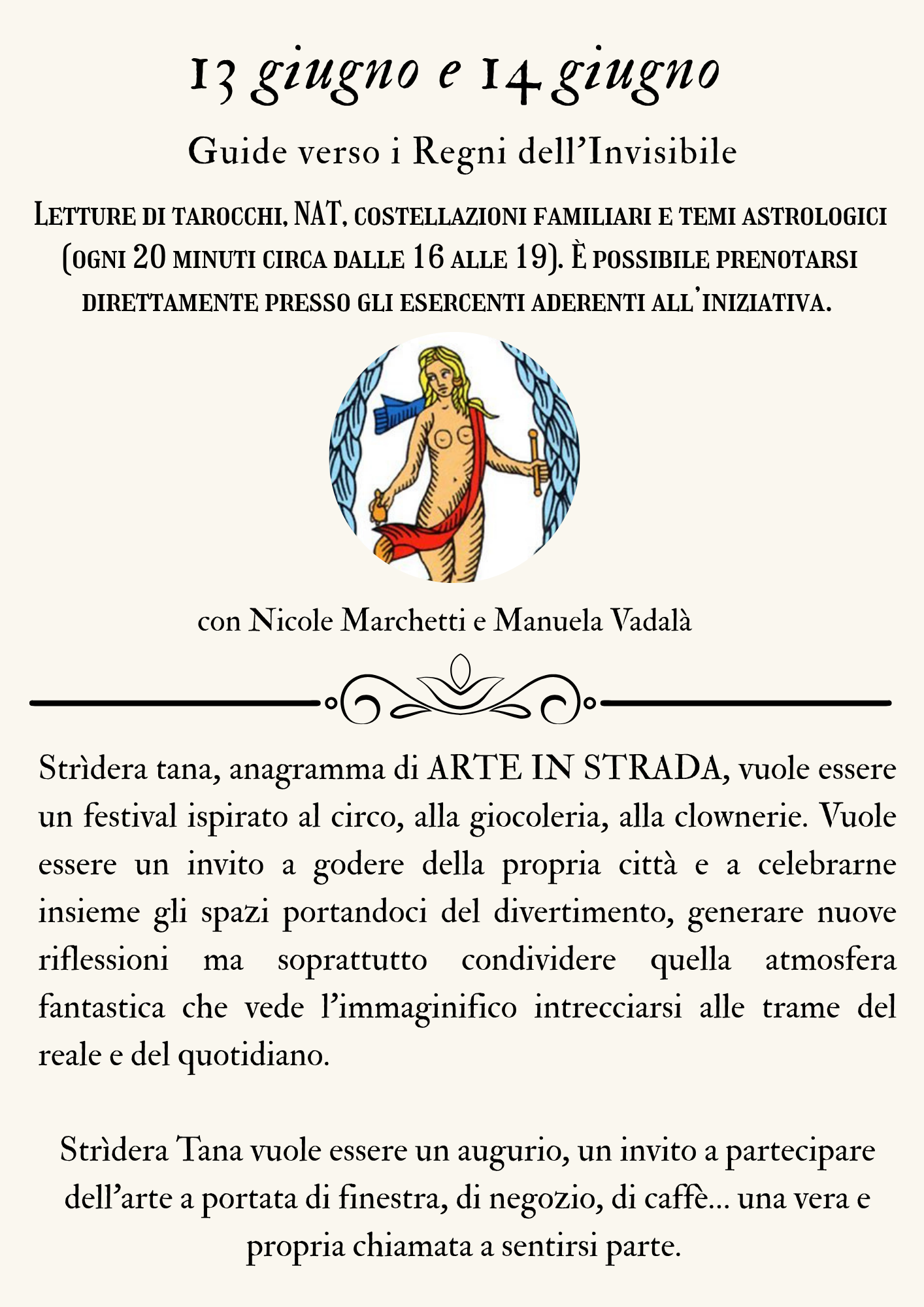 Letture di tarocchi, NAT, costellazioni familiari e temi astrologici (ogni 20 minuti circa dalle 16 alle 19). È possibile prenotarsi direttamente presso gli esercenti aderenti all’iniziativa.