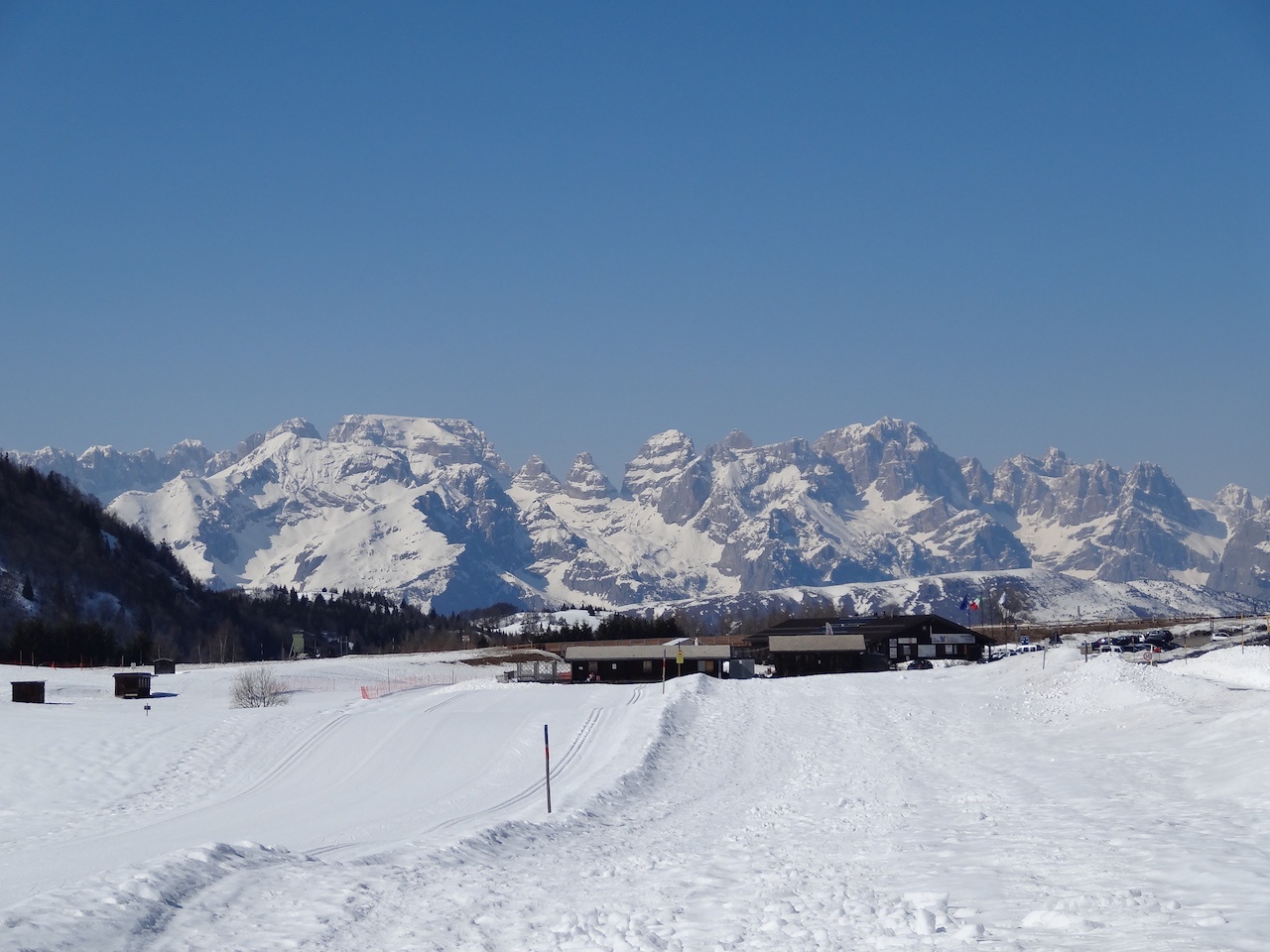 La piana delle Viote, situata a 1.568 metri di altitudine, è un’ampia conca innevata che si apre come una terrazza naturale: a nord lo sguardo spazia sulle Dolomiti di Brenta, mentre a sud dominano le Tre Cime del Monte Bondone.