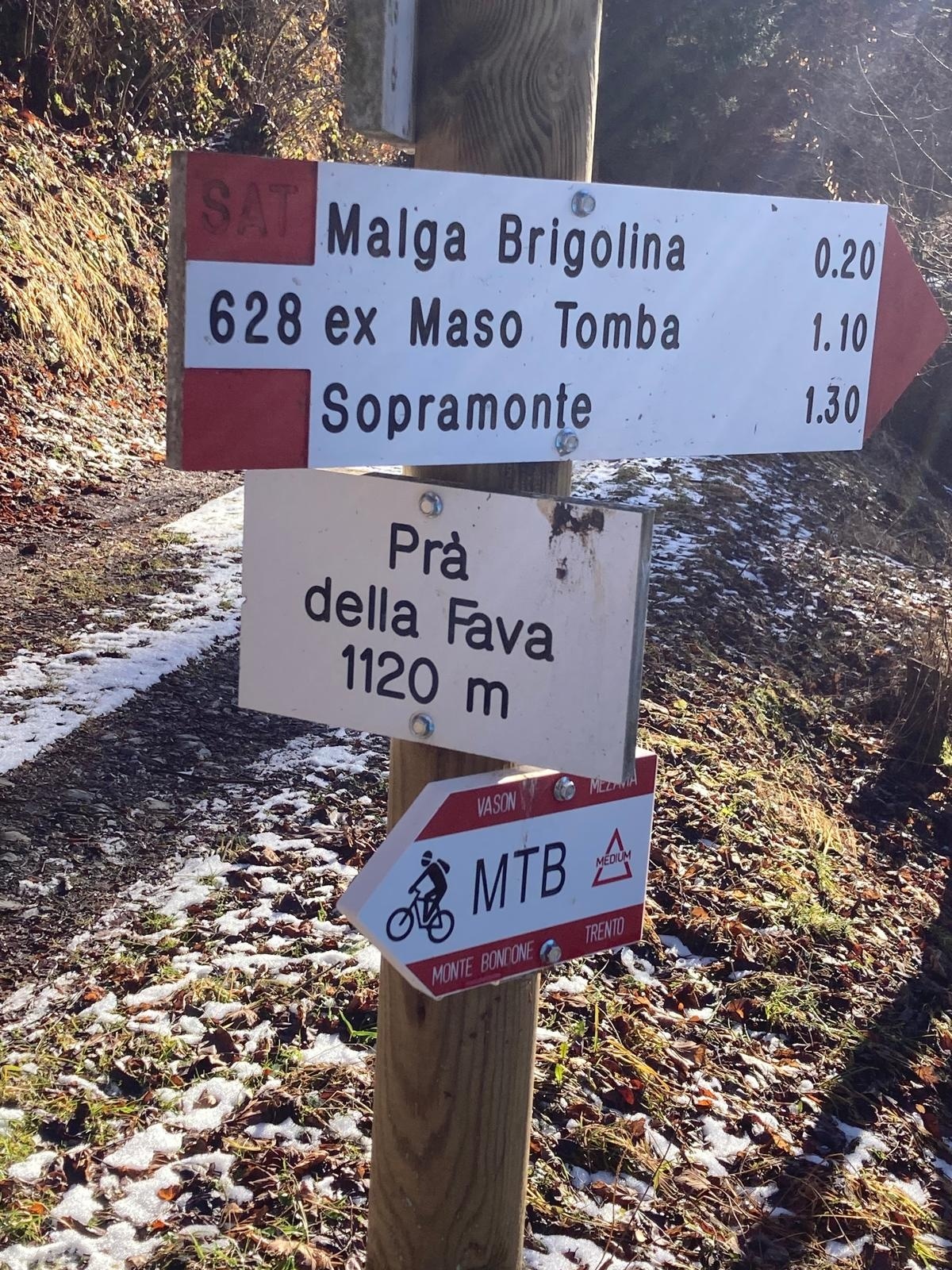 Variante che collega il bivio per malga Mezavia con il Prà della Fava, passando per Malga Brigolina. L'itinerario si sviluppa fino alla Brigolina su strada forestale e poi dalla malga risale per un tratto il sentiero SAT628 fino a Prà della Fava. La variante corre poco più bassa della strada forestale Selva proposta nel percorso principale.