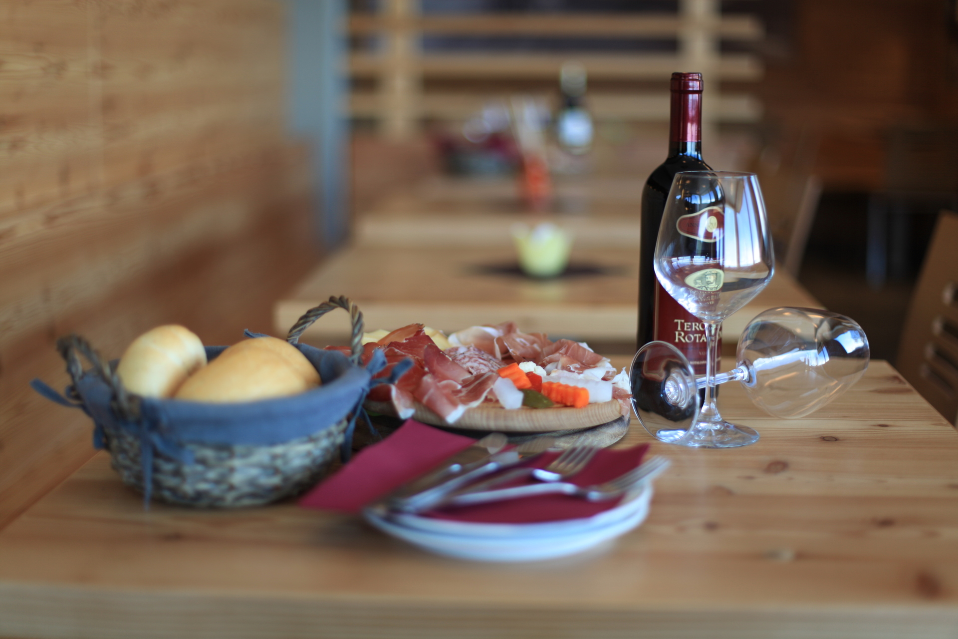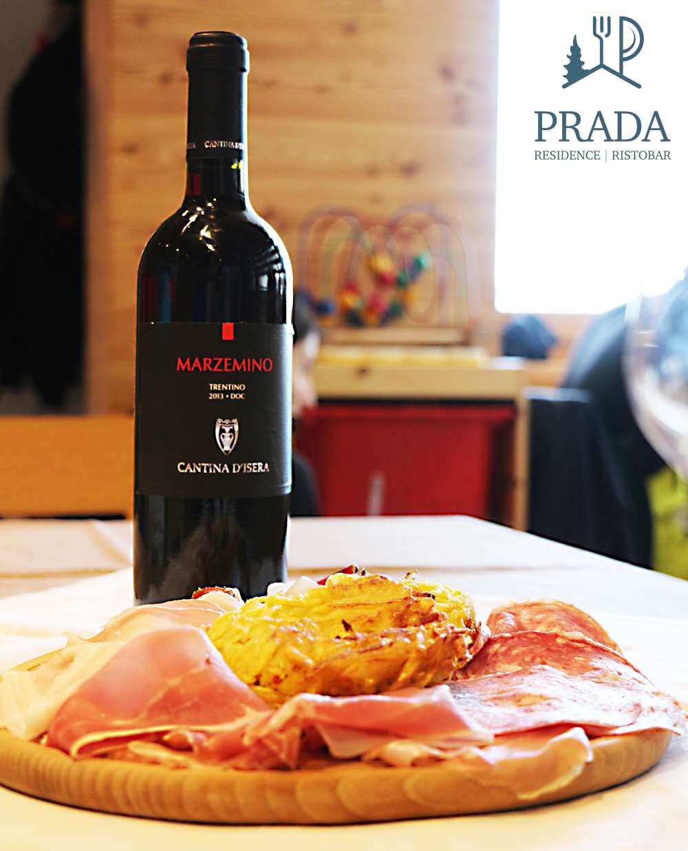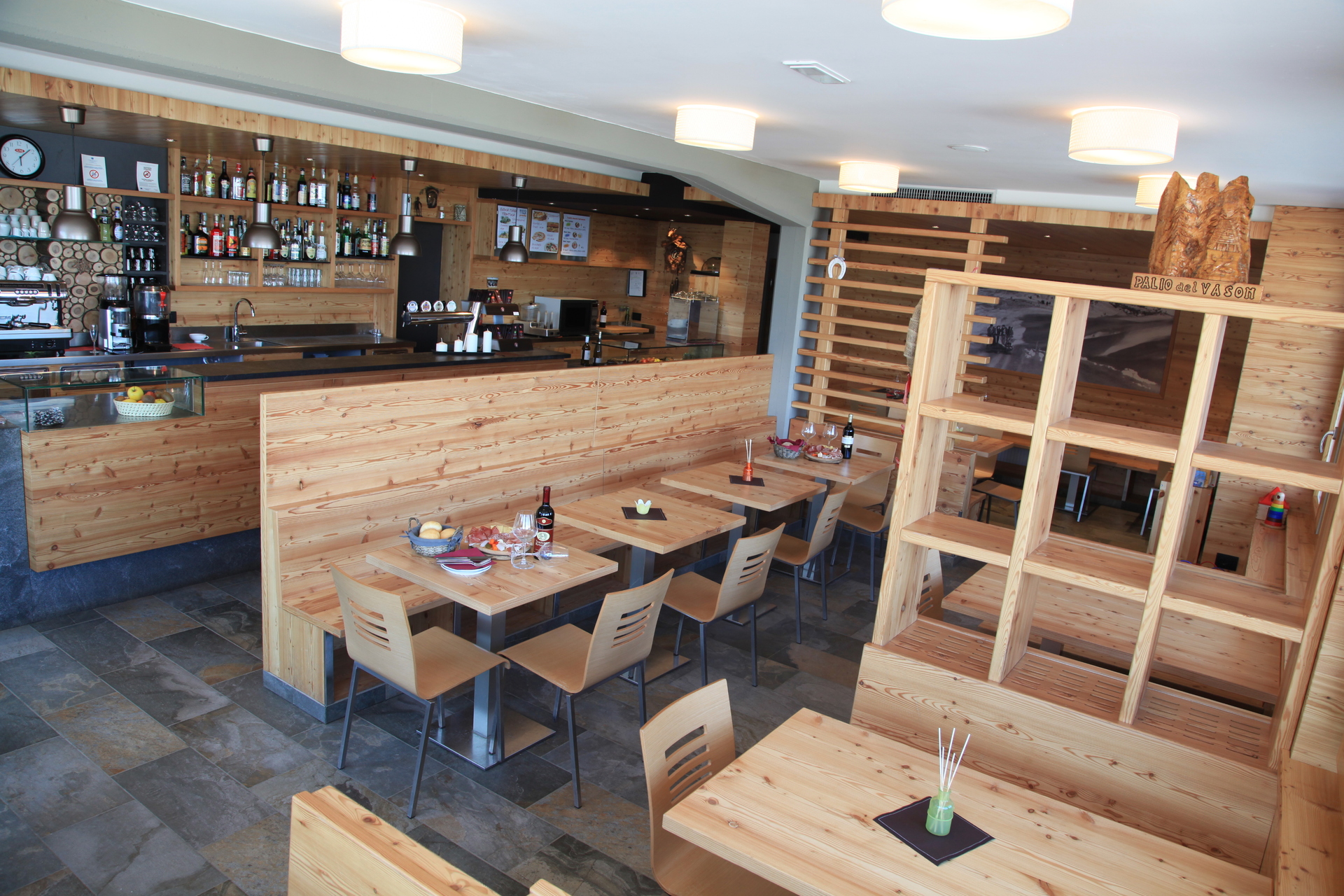 La nuova sala in legno di larice con il suo caratteristico colore rossiccio crea un ambiente caldo e “avvolgente” in cui gustare piatti della tradizione trentina (canederli, strangolapreti, carne salada, polenta e pasta de luganega) e ricette originali con prodotti selezionati e di fornitori fidati della zona!